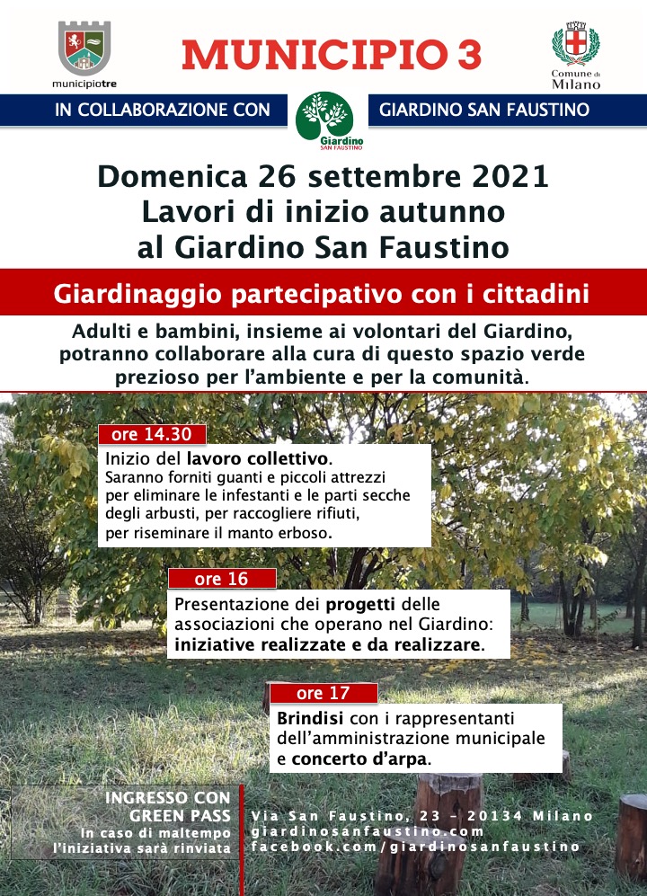 Domenica 26 settembre avremo un pomeriggio di lavoro collettivo al Giardino San Faustino, aperto a tutti! Chi vorrà, potrà aiutarci a togliere le infestanti, ripulire gli arbusti, seminare nuova erba nel prato danneggiato dall’aridità e dal calpestio… Poi illustreremo le prossime iniziative, e la giornata si chiuderà con un aperitivo e un soave concerto nella luce del crepuscolo.Saranno rispettate le misure anti CoVid19 e all’ingresso sarà richiesto il GREEN PASS.