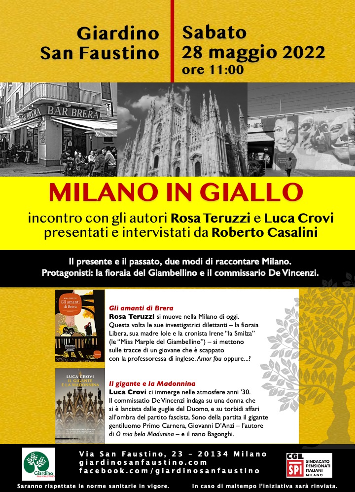 Vi invitiamo a un nuovo appuntamento con i libri nel Giardino San Faustino. Questa volta il tema riguarda un genere molto amato dai lettori: il romanzo “giallo”. Roberto Casalini condurrà l’incontro con Rosa Teruzzi e Luca Crovi, due dei non pochi autori che hanno scelto Milano come sfondo e fonte di ispirazione per intriganti vicende.