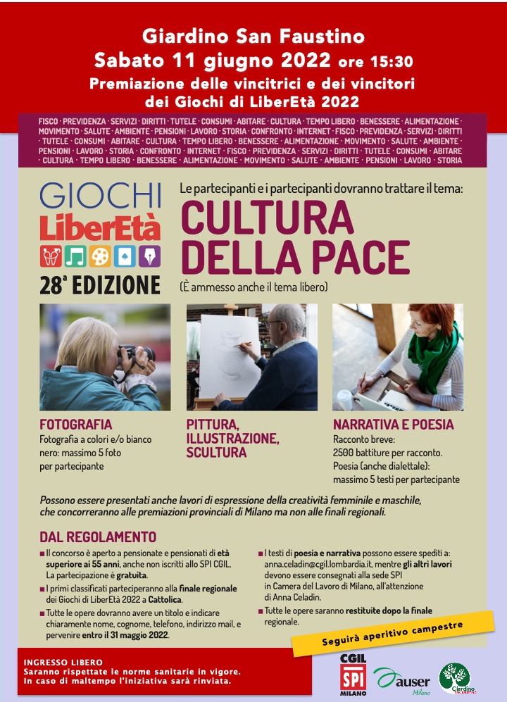 Sabato 11 giugno ritorna al Giardino la premiazione dei concorsi di arte e creatività promossi da LiberEtà, rivista del sindacato dei pensionati SPI-CGIL. Saranno esposte le opere finaliste e la proclamazione dei vincitori sarà seguita dalla lettura degli scritti premiati.